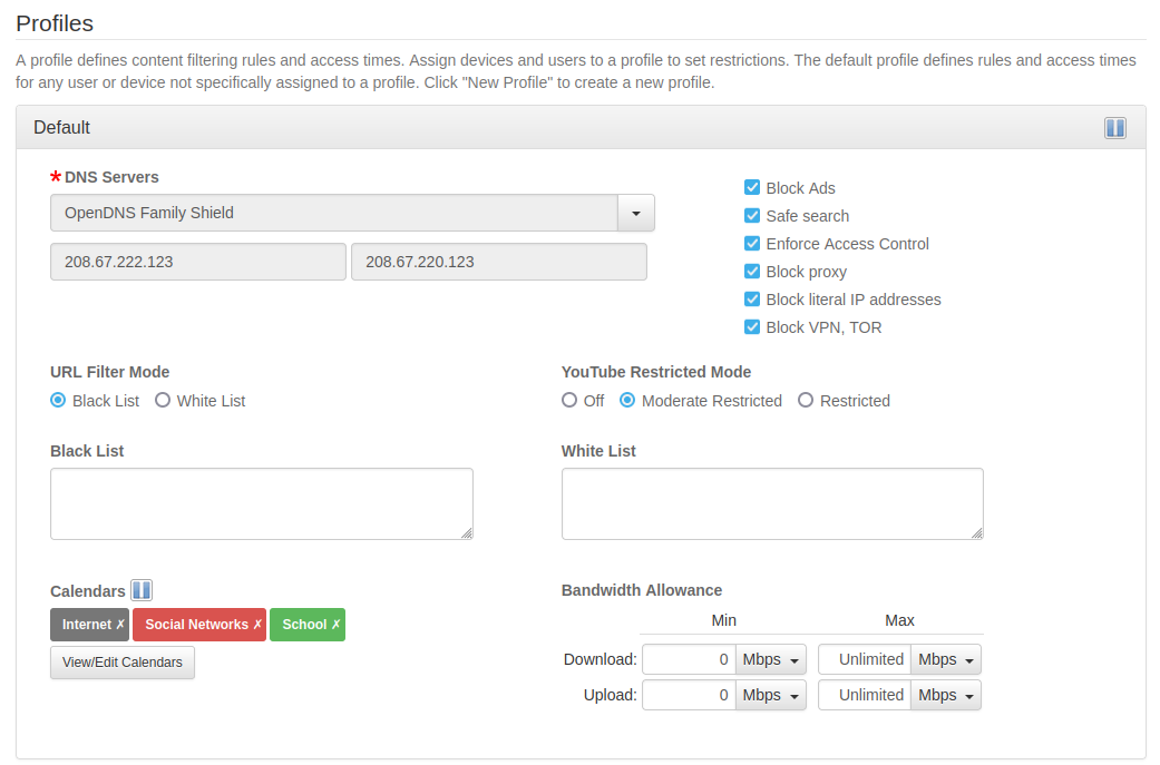 Schedule Internet access with one or multiple calendars by profile and domains.