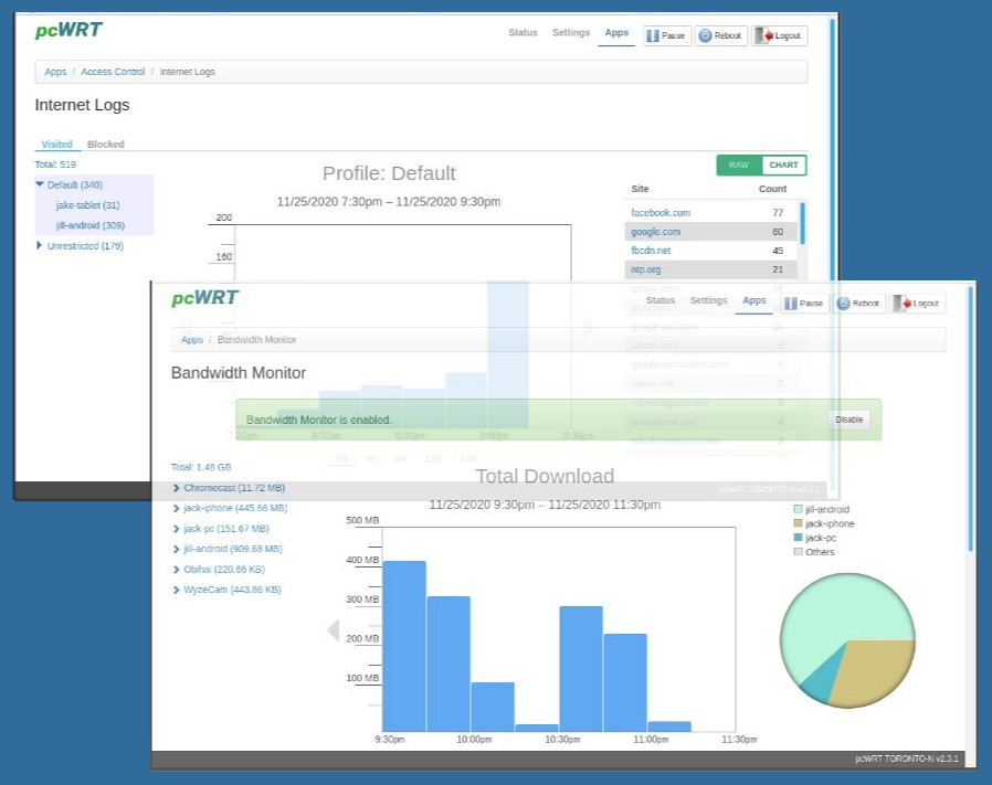 The pcWRT router provides insights to these questions through the Internet access logs and the Bandwidth Monitor.