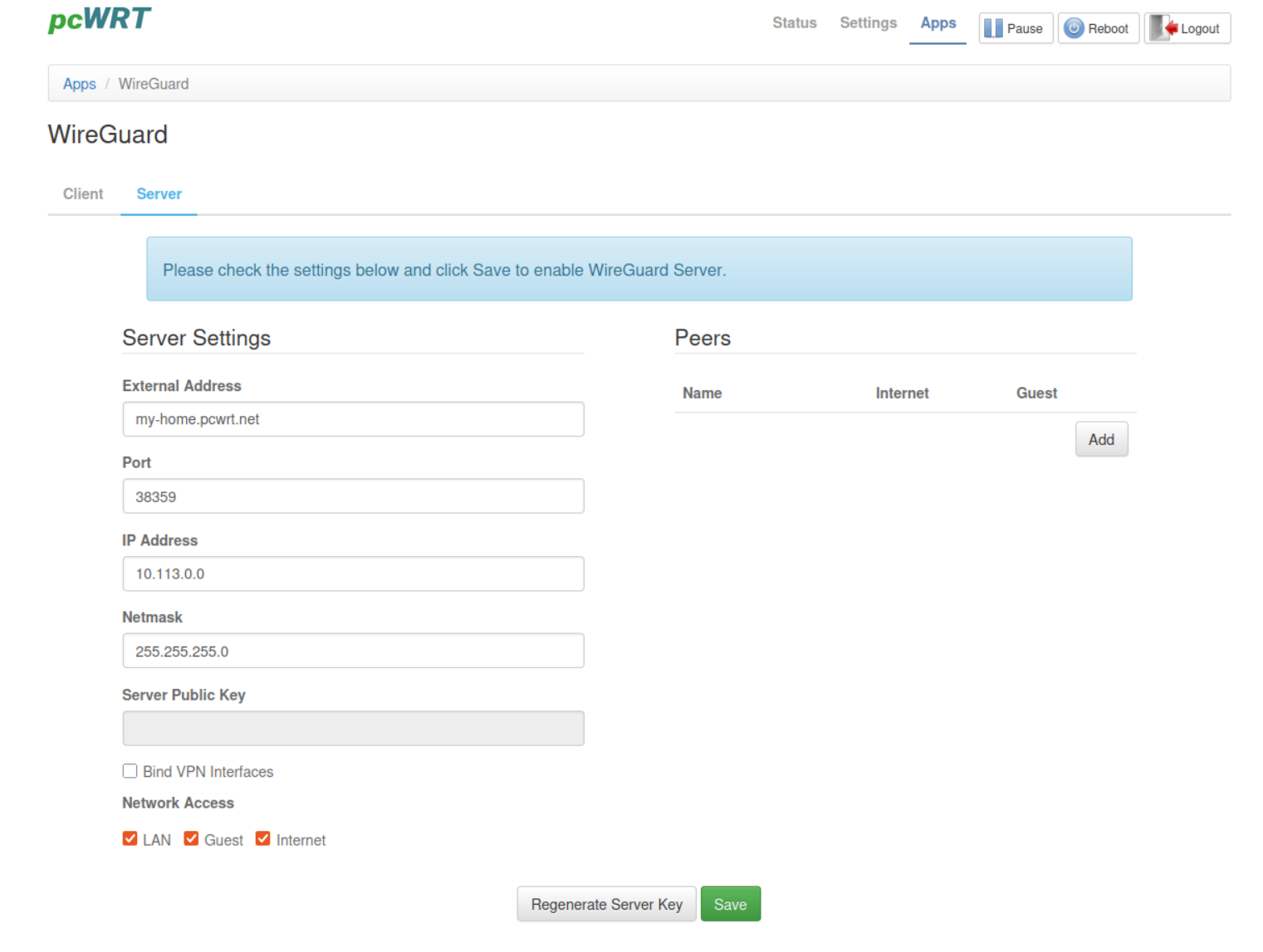 Enable the WireGuard Server and Create a Peer Connection