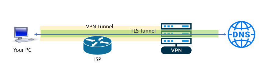 DNS encryption protocols, i.e., DNS over HTTPS (DoH) and DNS over TLS (DoT), encrypt your DNS queries before sending them over to the DNS service. Even though the queries still pass through your ISP gateway, the ISP can no longer see the domain names.